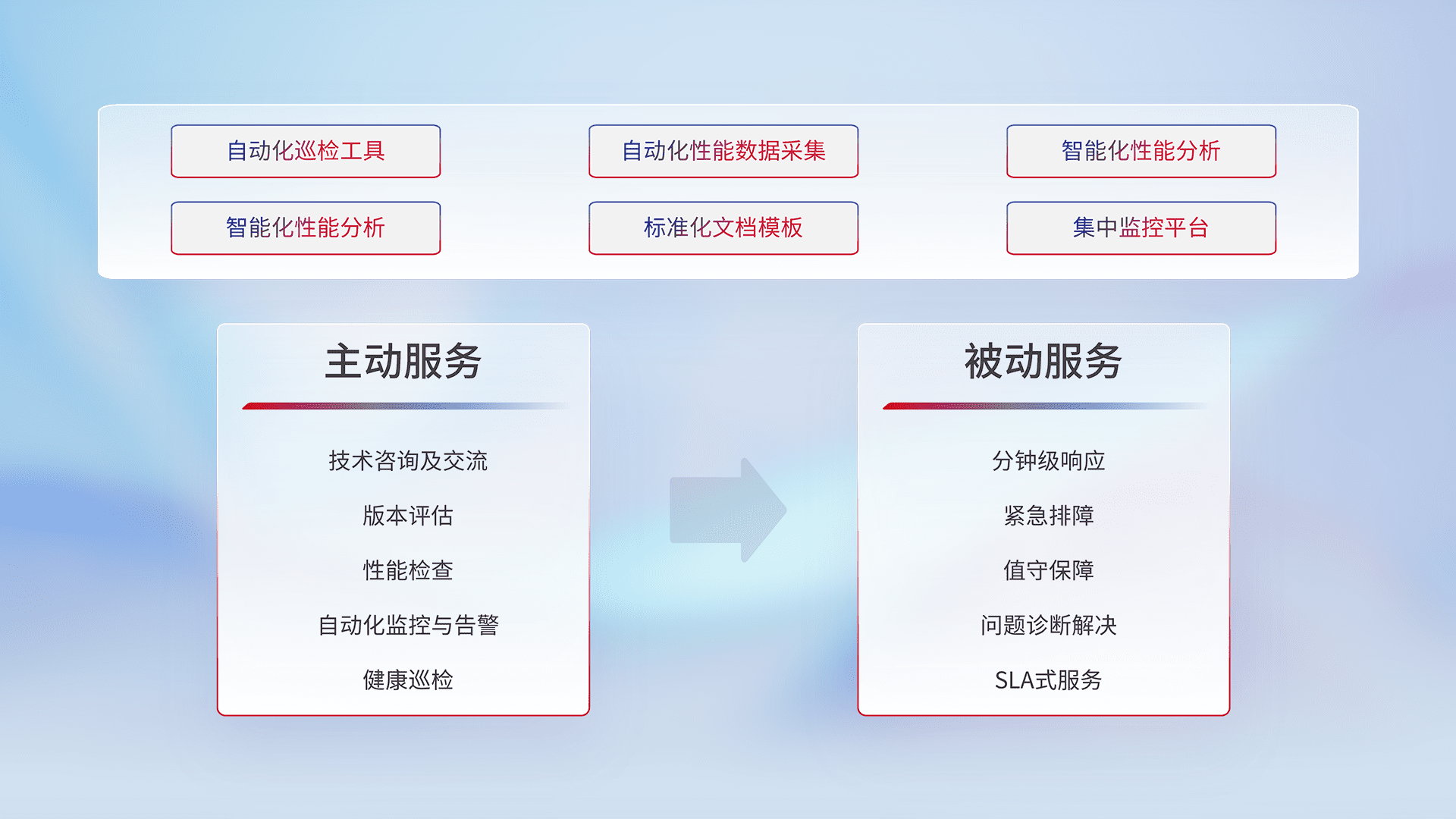 智能化工具和标准化文档,,,保障服务质量,,,提供主动服务(包含技术咨询、、、版本评估、、、、性能检查、、、、自动化监控与告警、、健康巡检)和被动服务包含(分钟级响应、、、紧急排障、、、值守保障、、问题诊断解决、、SLA服务)。。。